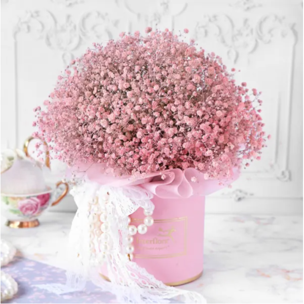Make a dream-like occasion celebratory with this lovely arrangement of gypsos in light pink. These lovely flowers make for a very pretty sight just about anywhere. White lace ribbon for a finishing touch adds to the elegance, one that is made to delight your loved one.